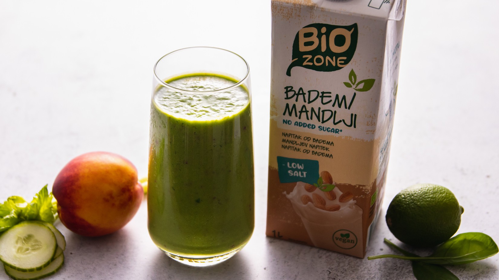 Dodajte 150 ml mililitara napitka od badema i ocijeđeni sok polovice limete. Po želji dodajte žličicu javorovog sirupa ili meda da se okusi izbalansiraju.